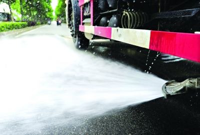 7日下午在唐家墩側(cè)路旁,江漢區(qū)城管局的灑水車正在進(jìn)行灑水測試。記者發(fā)現(xiàn)這臺灑水車與眾不同:車底部的出水口裝上了一個“鴨嘴”,噴出的水流呈扇形,且貼近地面,像一把鏟子。